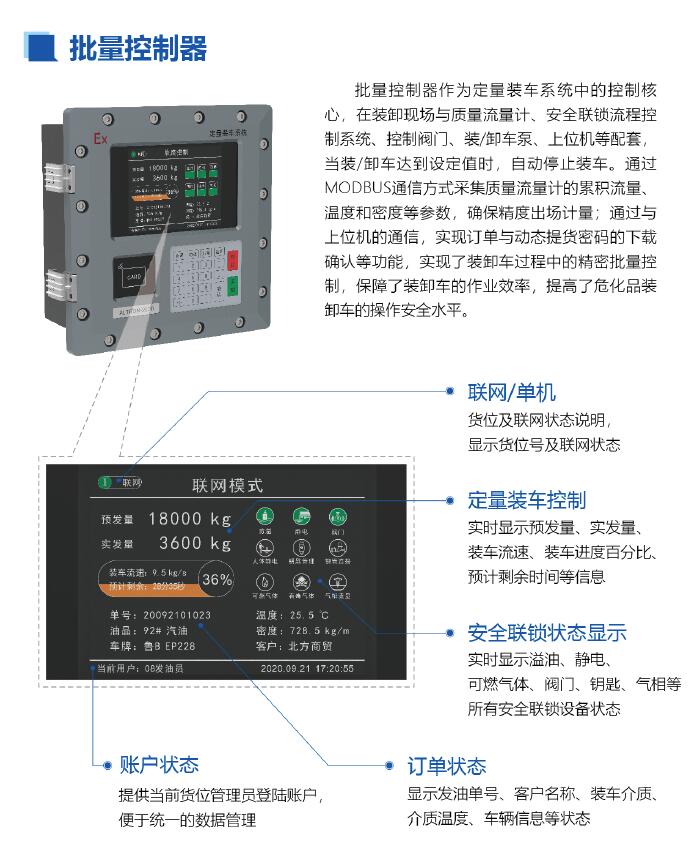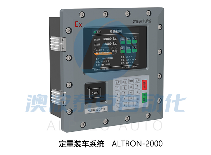 ALTRON-2000定量裝車控制器,采用性能更優(yōu)越的Cortex-A7內(nèi)核處理器為核心,提供快速的數(shù)據(jù)處理和流暢的界面切換;基于此核心處理器,內(nèi)嵌多種灌裝程序,配合K系列流量計0.1%精度,裝車精度可達(dá)0.2%。